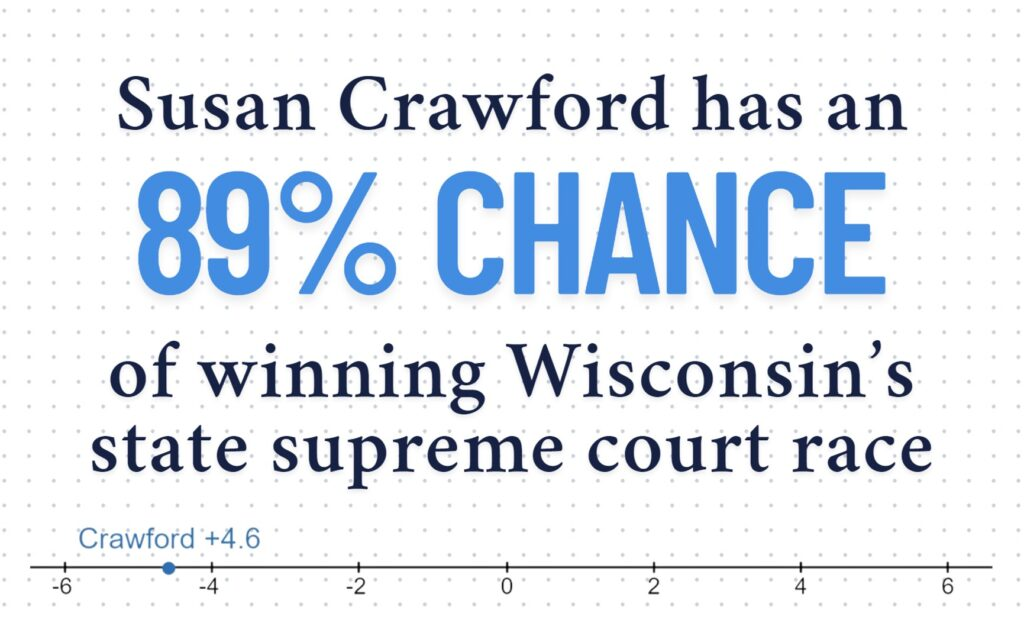 The Wisconsin Supreme Court forecast was the first finalized model we published in 2025. There were a lot of factors in this race that made it difficult to accurately project. For one, we were the only website that put out a model for the race. This meant that we had no direct references to “check” the model to ensure that it more or less aligned with consensus ratings. This was likely because of the second problem, which was that the race was sparsely polled. The final forecast ended up only relying on five polls, the vast majority of which were sponsored by Republicans (4/5 of them).