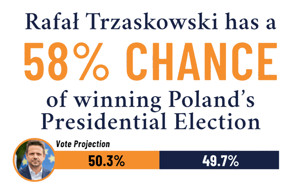 The Polish Presidential election was the first election we forecasted where the statistically favored candidate ended up losing the election. Overall, our projections were still well within the margin of error. We only ended up overestimating Trzaskowski by 1.2%, and the forecasted odds kept this race within the tilt/tossup category.