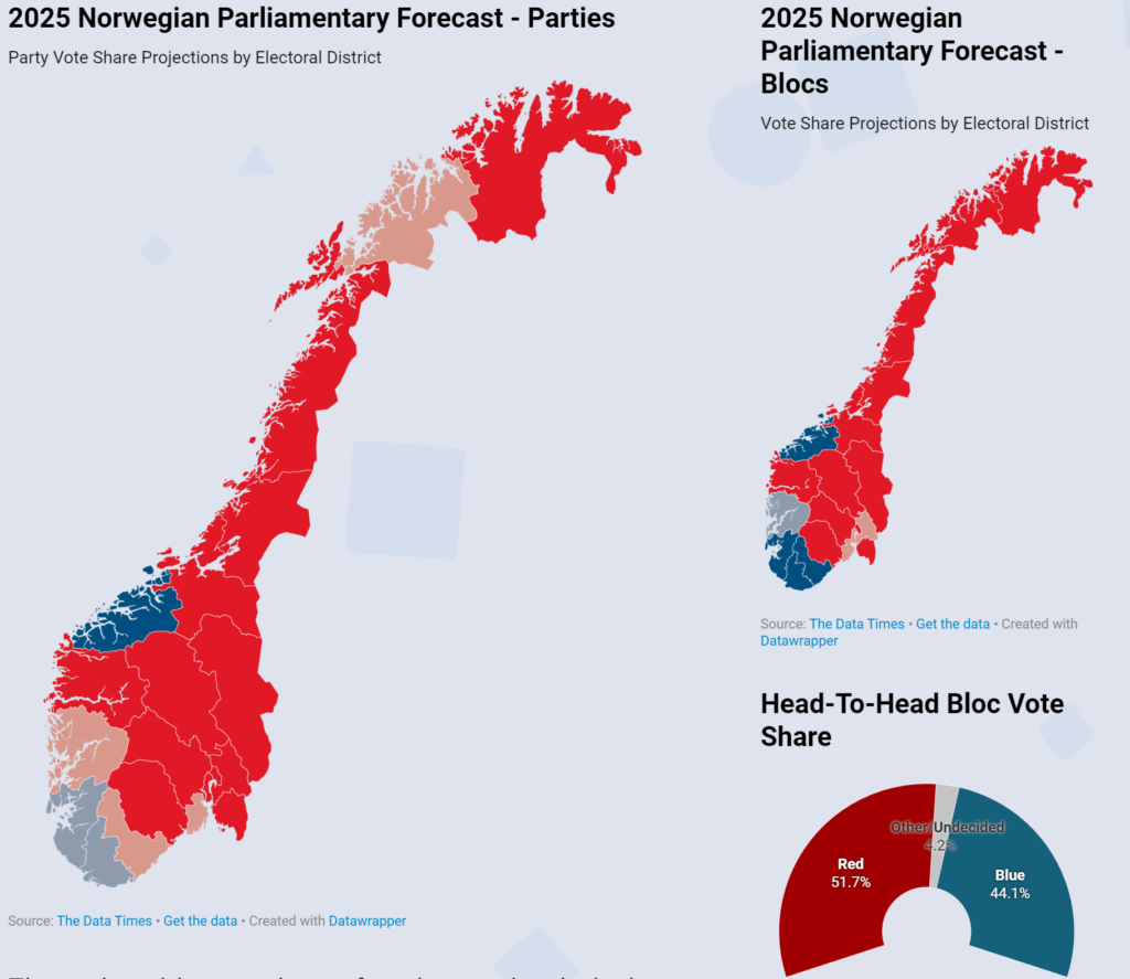 Similar to the Polish Presidential Election, the populist right-wing FrP massively overperformed polling. Out of the five websites I found that modeled this election, not a single one managed to forecast the entirety of the FrP’s support. Additionally, the centrist liberal party Venstre received only 3.7% of the nationwide vote share, which entitled them to only 3 seats rather than the projected 7.