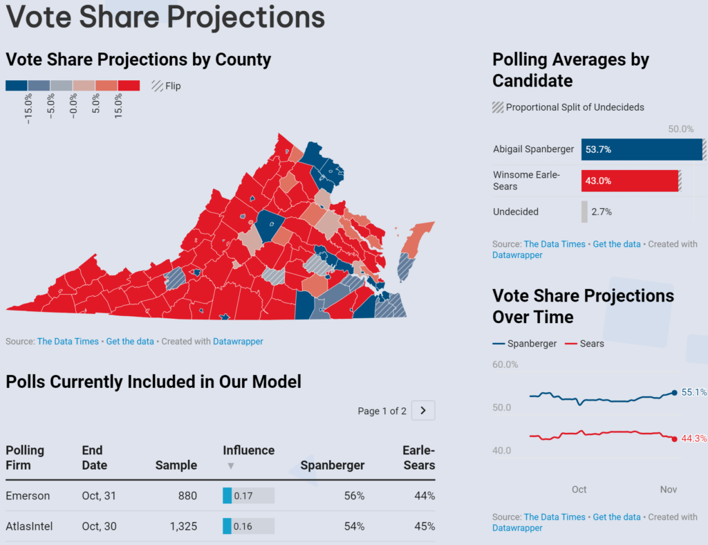 Out of every model that wasn’t influenced by their own polling, The Data Times was the most accurate for both Virginia’s and New Jersey’s gubernatorial elections. That being said, we were still decently behind the real margins of both candidates. The results of this election also support the need for a greater emphasis on last-minute polling, considering the subtle but sudden widening of the trendlines in both races towards the end of the campaign.